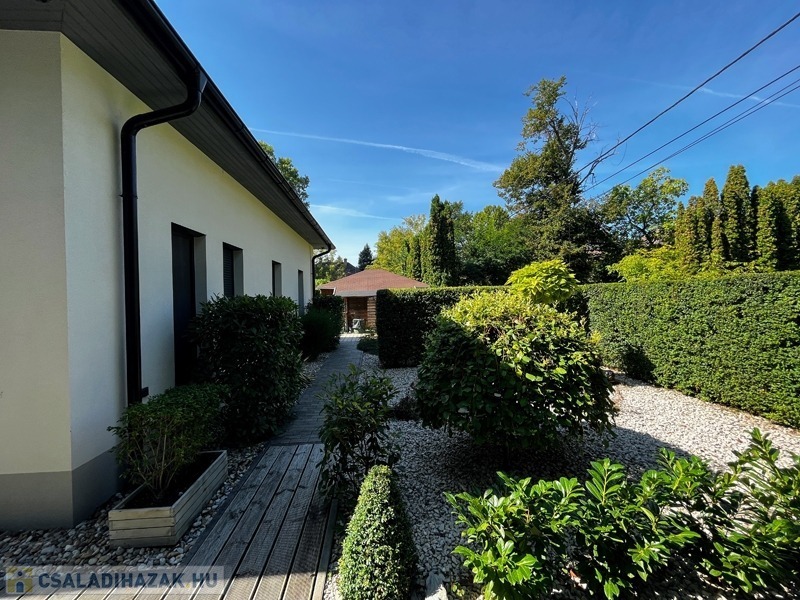 A 960 nm-es telek teljes egésze profi kertész által, a hely adottságait figyelembe véve tervezett és kivitelezett, a kerítés mentén telepített sövény pedig megakadályozza a belátást a kertbe és a teraszra egyaránt.