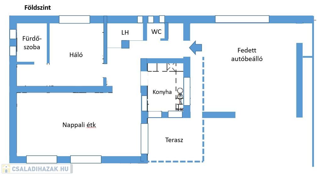 belépő cipős-szekrénnyel, + külön vendég WC-vel, tágas nappali-étkező (légkondival / padlófűtéssel) konyha- és terasz-kapcsolattal, + fürdőszobás hálószoba beépített ruhásszekrényekkel.