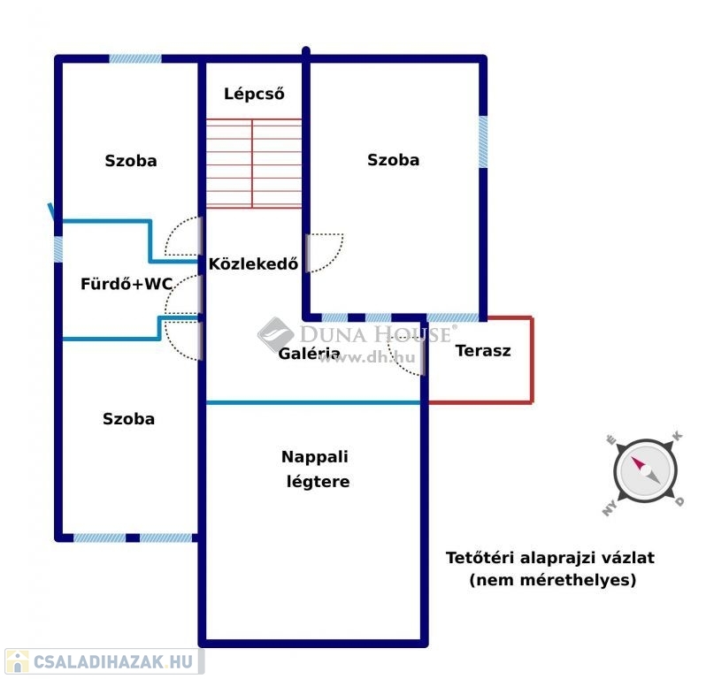 A tetőtéri szinten 3 szoba, kádas fürdőszoba, teraszos galéria található.