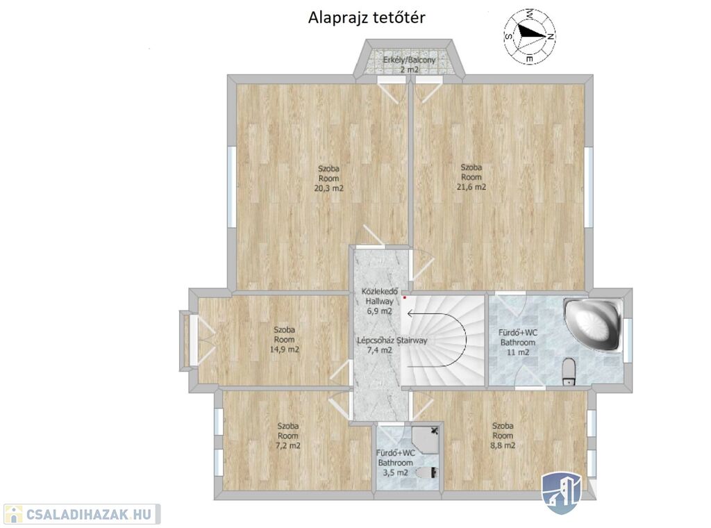 A tetőtéren 4 nagy és egy félszoba található. Itt két fürdőszoba is megtalálható.
