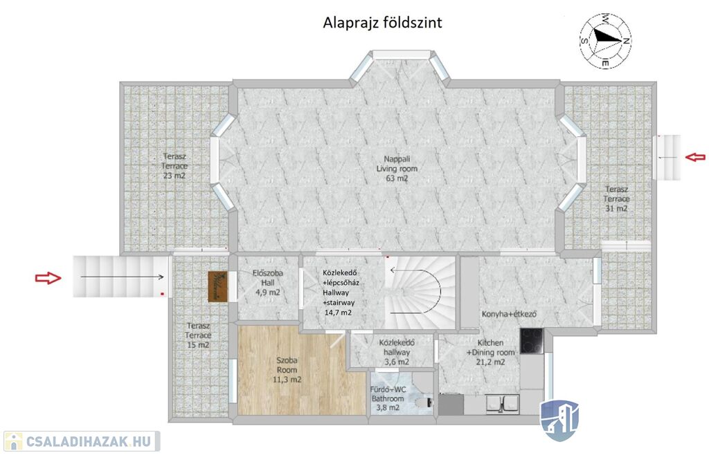 A földszinten egy 63 m2-es nappali található kandallóval, egy nagy gépiesített konyha étkezővel, további egy szobával és egy fürdőszobával. Elől és hátul is nagy terasz lett építve hozzá a szinthez.