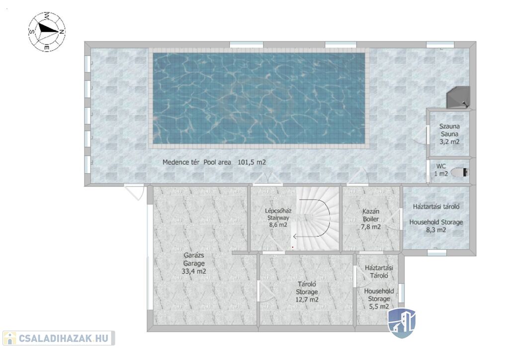 A ház szuterén részén egy több, mint 100 nm-es medence tér található meg, szaunával és úszómedencével. Itt fal, padló és léghűtés és fűtés is van. Ezen a szinten találhatók még tárolók is.