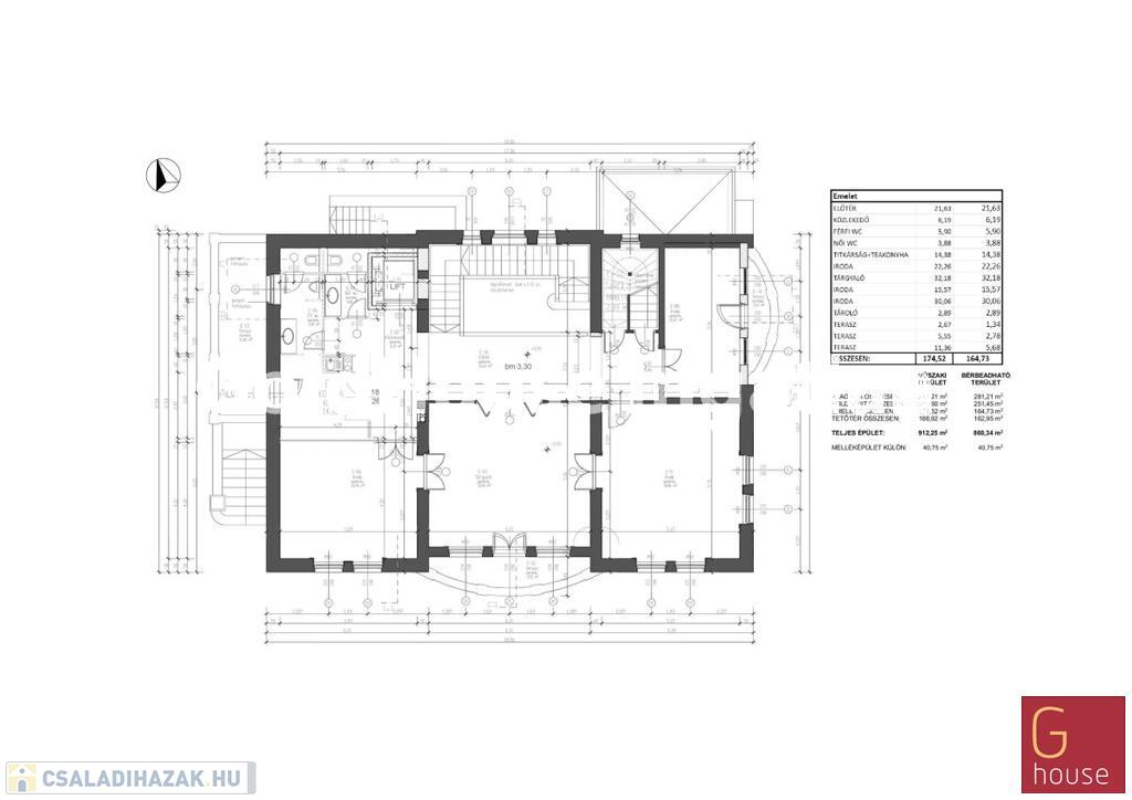 2. emelet: 5 iroda, teakonyha, mosdók, erkély,