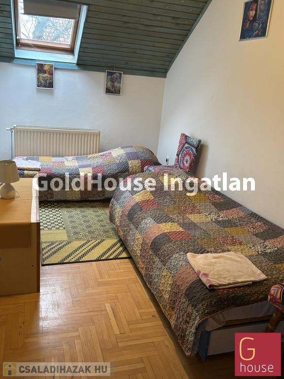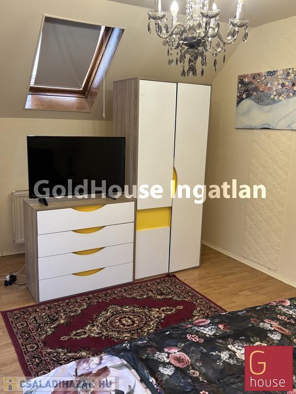 A nappaliból vezet az emeletre a lépcső, ahol egy nagy és két kisebb hálószoba található. A nagyobb szobához kis udvarra néző erkély csatlakozik. A pihenőből kis folyosón keresztül vezet az út a nagy sarokkádas fürdőszobába. (Szemben a wc bidével.) (Mindkét fürdőben mosógép kiállás van, felső szinten mosógéppel.)