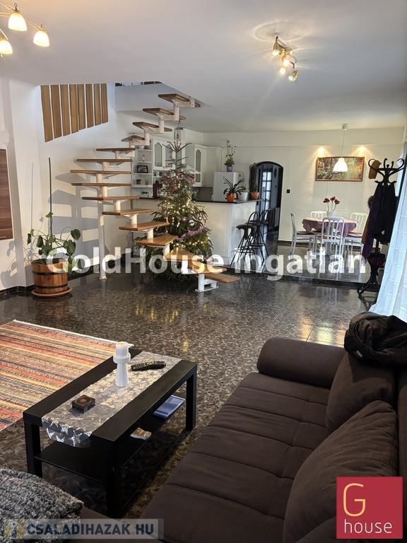 Két szintes. Alul egy 54 nm-es nappali, egy jól felszerelt amerikai konyhával, étkezővel és egy közlekedővel csatlakozó lakrész egy szobával, fürdővel. (Külön wc). A nappaliban élmény kandallós fűtőtest.