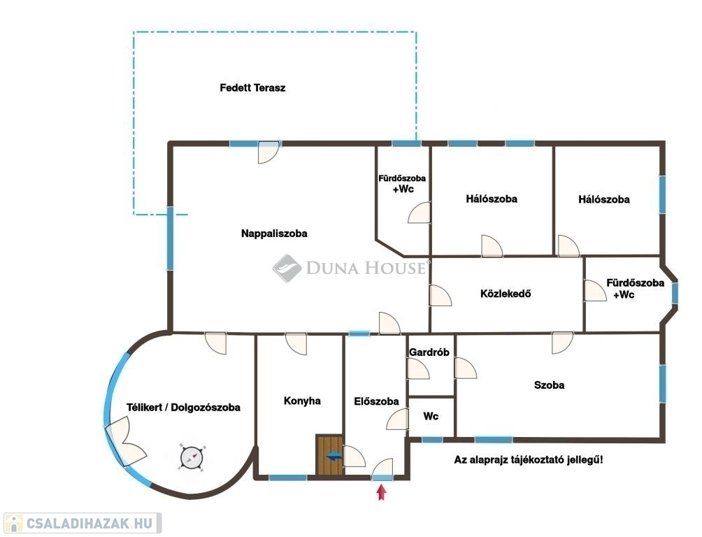 A lakótérben egy hatalmas nappaliszoba, 3 külön bejáratú hálószoba, egy hangulatos télikert (fűtött, szobaként szintén remekül használható), két fürdőszoba+wc (az egyik a szülői hálóhoz csatlakozó privát fürdőszoba), egy külön wc, egy ablakos konyha, egy előszoba, és egy a helyiségeket összekötő közlekedő helyiségek kaptak helyet. A legnagyobb hálószobához gardróbszoba is csatlakozik, továbbá a helyiség konyhapulttal is felszerelt, így akár önálló apartmanként is jól használható. A nappaliszobából hatalmas, több, mint 30m2-es fedett teraszra léphetünk ki, mely szeparált, belátástól mentes pihenést kínál a nap minden szakában.