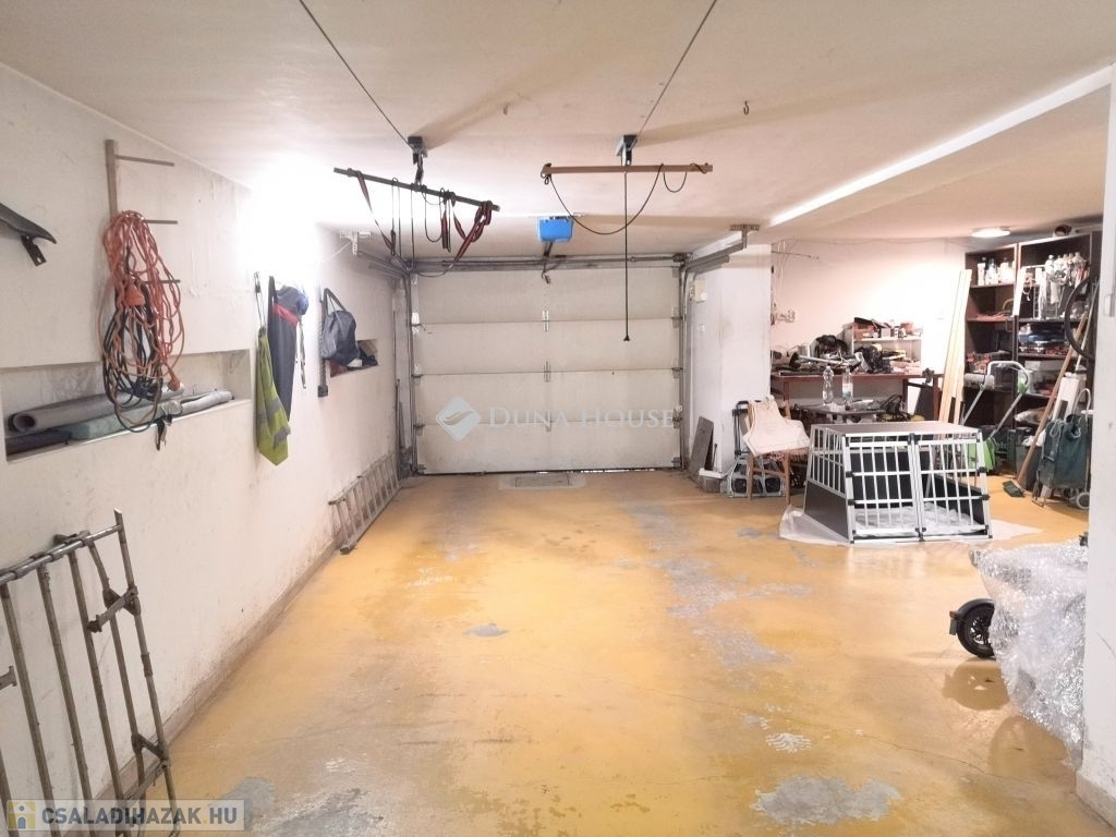 A lakószint alatt 110m2-es szuterén található, mely a lakásból is elérhető belső lépcsőházon keresztül. A szinten több tárolóhelyiség, egy kazánház, műhely-sarok, mosókonyha mellett, akár 3 autó parkolása is megoldott. A garázslehajtó a fagyos téli hónapokban fűthető, így a beállás az év minden szakában kényelmes és akadálytalan, a kapuk természetesen távirányítással nyithatóak.