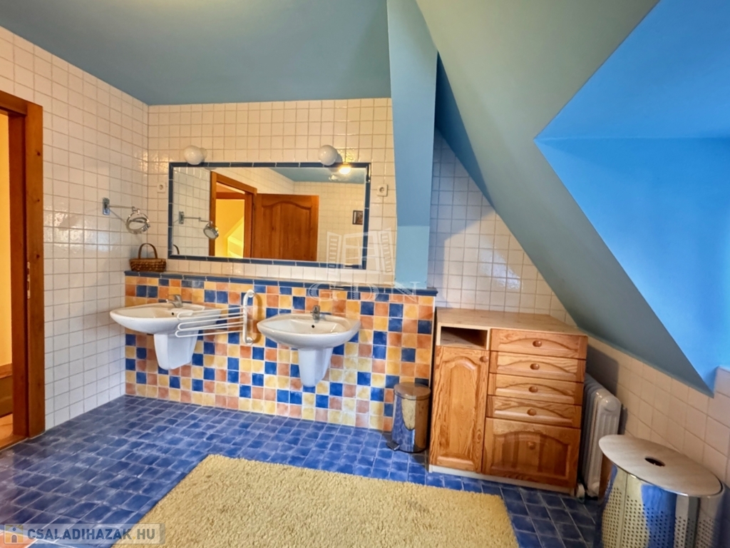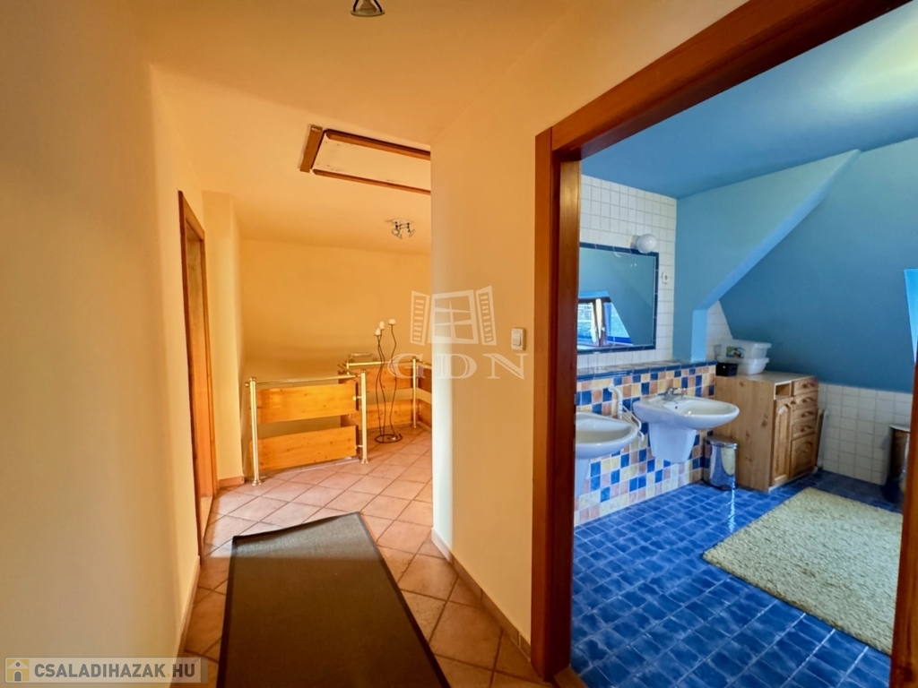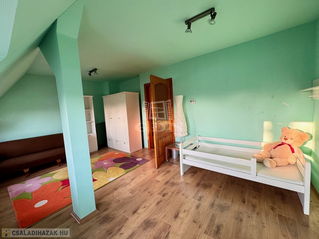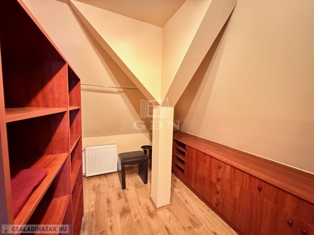 -Emelet: lépcsőház(11,16m2), közlekedő(2,64m2), WC+kézmosó(4,16m2), 2 szoba(20,48m2, 12,41m2), gardróbszoba(5,6m2), fürdőszoba+WC(10,2m2), erkély(2,5m2).