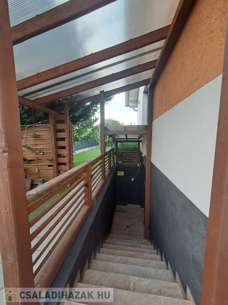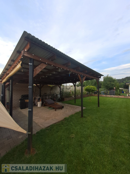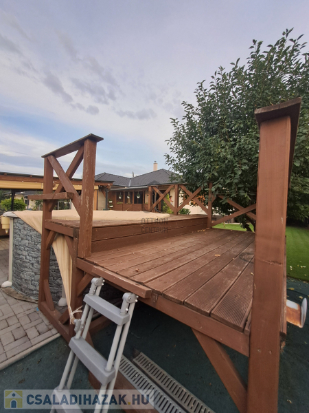 430 m² teljesen parkosított kert automata öntözőrendszerrel , örökzöldekkel, filagóriával, magas ágyással, ellenáramoltatós, hőgenerátoros 3,5 méter átmérőjű, medencével,