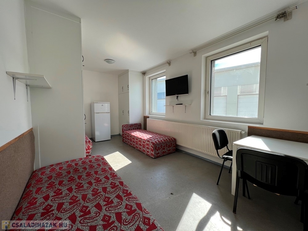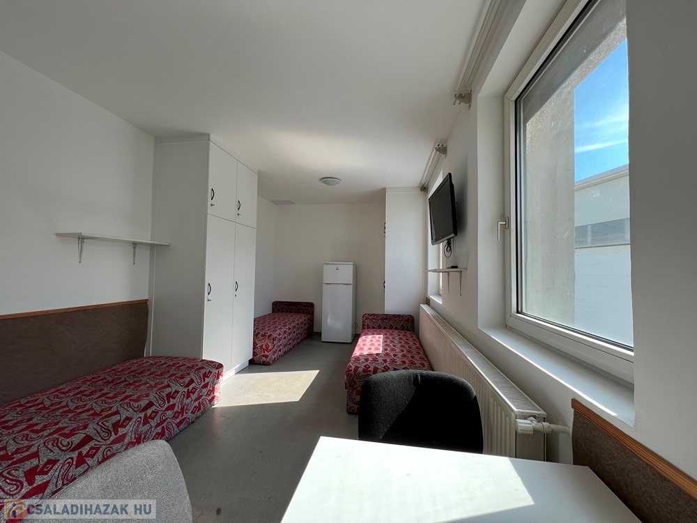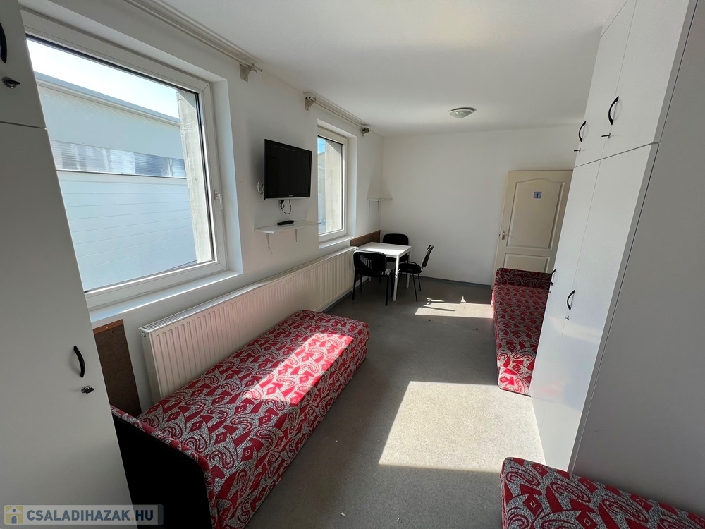 Győr-Likócs természet közeli, családi házas nyugodt övezetében, AUDI gyártól, Ipari Parktól, Belvárostól, M1-es autópályától pár perces autótávolságra, 2.100 m2-es összközműves telken lévő egyszintes, részben felújított állapotú épületben, összesen 5 külön bejáratú szobával felszerelt, (átlagban 4 fő befogadására alkalmas 18 m2; 25 m2; 25 m2, 22 m2, 16 m2 nagyságú) továbbá 3 zuhanyzóból álló fürdőszobából, nemek szerinti WC-ből, különálló konyhából, különálló mosókonyhából álló, 168 m2-es bútorozott és gépesített 20-21 fő befogadására alkalmas épület/panzió/ház kiadó.