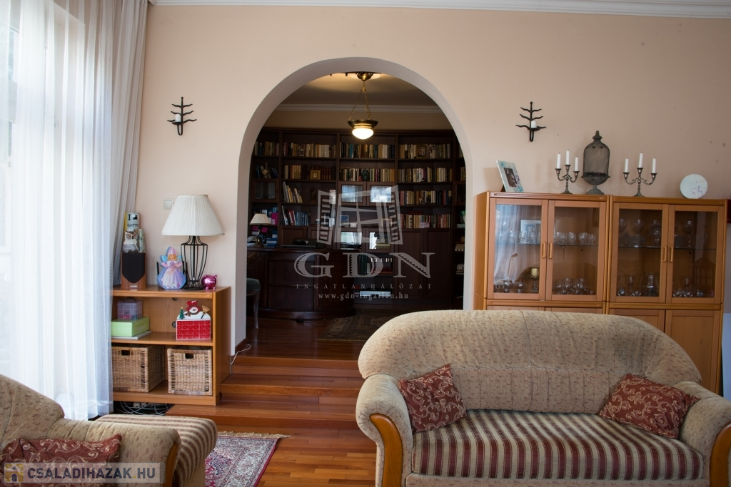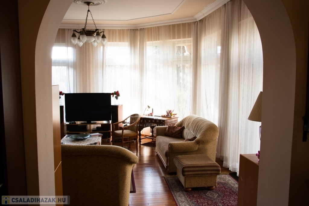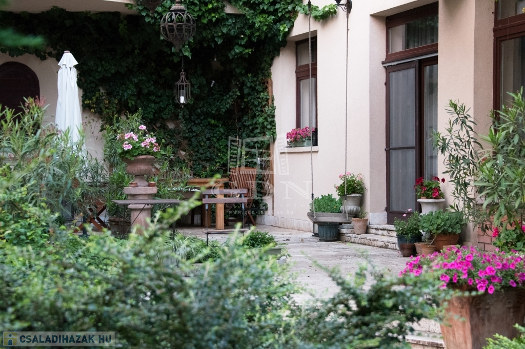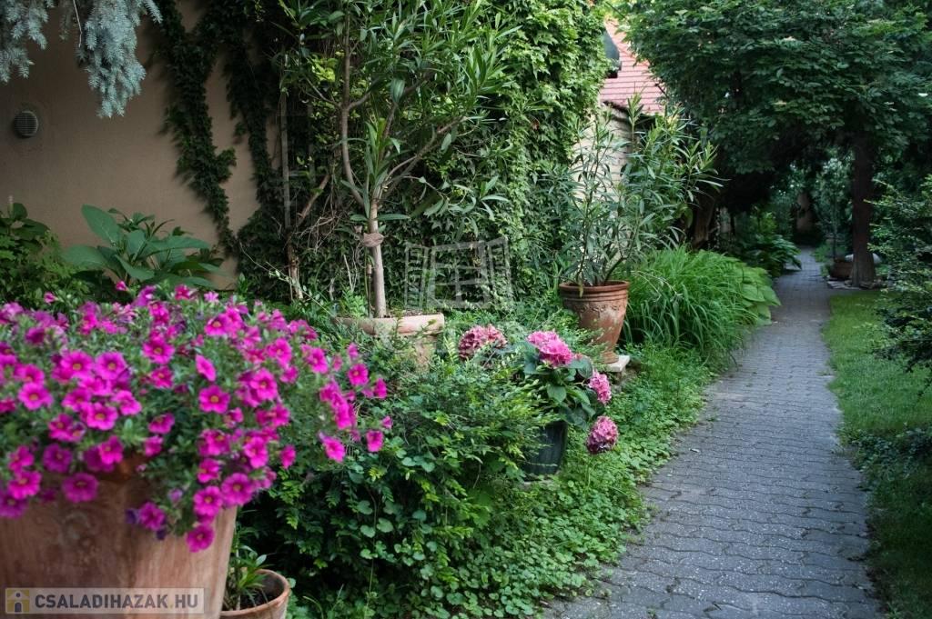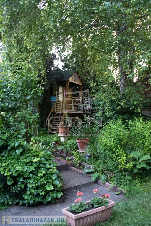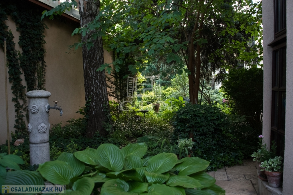A ház legnagyobb értékes dísze a kert, őspark, mini arborétum. Egy beállt kert, különleges növények, fák, virágok sokasága, pergola, fedett terasz, gyermek játszó-faház, kerti ösvények teszik romantikus hangulatúvá, ahol több helyen van lehetőség pihenésre, főzésre, szabadtéri tevékenységekre. A levegő oxigén-dús, és a nyári melegben néhány fokkal alacsonyabb a hőmérséklet a telken, klímára nincs is szükség.