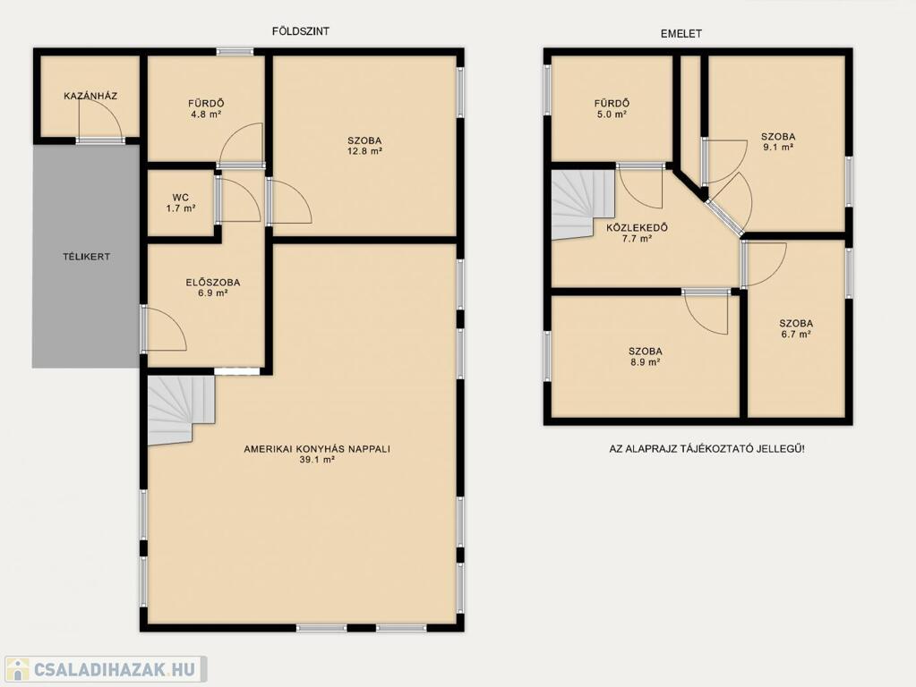 A 107 m²-es, kétszintes ház praktikus és élhető kialakítású, minden helyiség világos, jól berendezhető, és kellemes térérzetet nyújt.