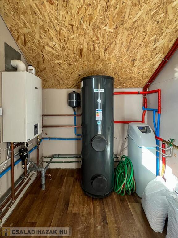 A ház fűtéséről egy kondenzációs gázkazán gondoskodik radiátoros hőleadással, melyet hamarosan fa tüzelésű kandalló egészít ki – nemcsak hangulatos, hanem hatékony kiegészítő fűtés is lesz.