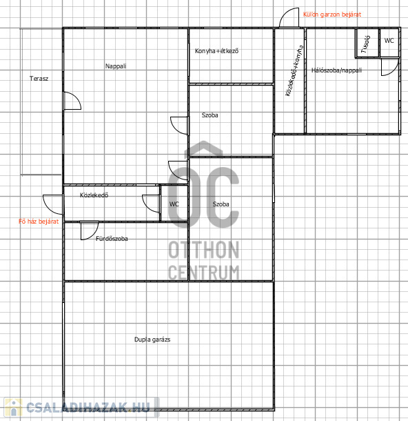 A fő házba a fedett, elkerített teraszról léphetünk be, ahol az előszobából nyílik a nagy fürdőszoba, külön helyiségben a wc, majd tovább lépdelve egy nagy nappaliba érkezünk. Innen nyílik egy hatalmas szoba, valamint egy kisebb szoba is és a konyha-étkező.