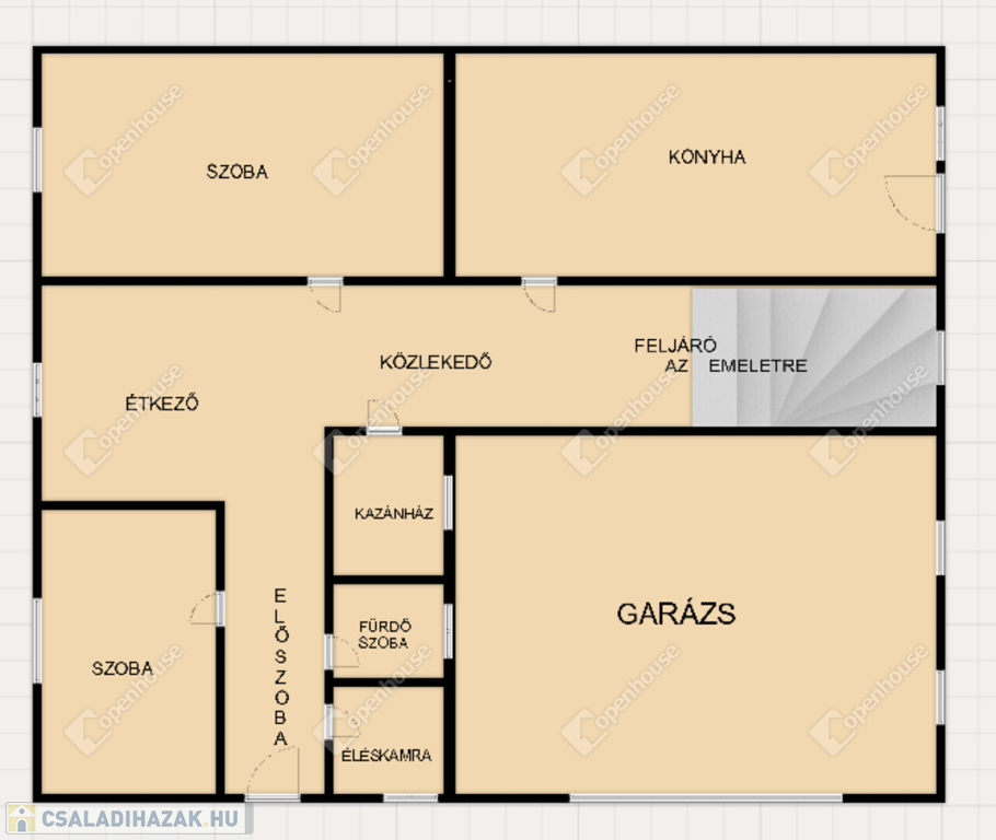 - emeleti szinten: tágas közlekedő, lépcsőház, három kényelmes méretű hálószoba amelyből kettő egymásba nyílik illetve egy az udvarra néző terasszal rendelkezik, fürdőszoba (innen közelíthető meg a padlástér)