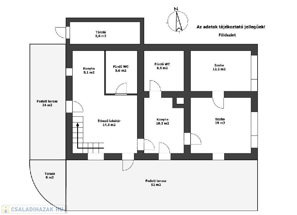 Az épület földszintje vastag vályog falakkal rendelkezik, a tetőtér téglaépítésű, így egyszerre nyújt kiváló hőszigetelést és stabilitást. A házhoz tartozik egy összesen 84 m2-es terasz, amelyből 76 m2 fedett, így bármilyen időben kényelmesen használható.