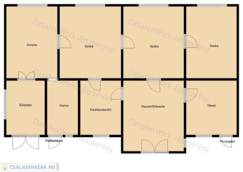 - rendelkezésre álló helyiségek: előszoba, előtér, konyha, fürdőszoba/WC, nappali, 3 db szoba, tároló és kamra,