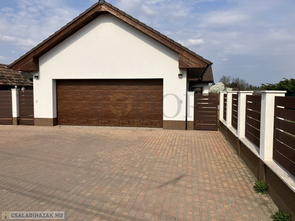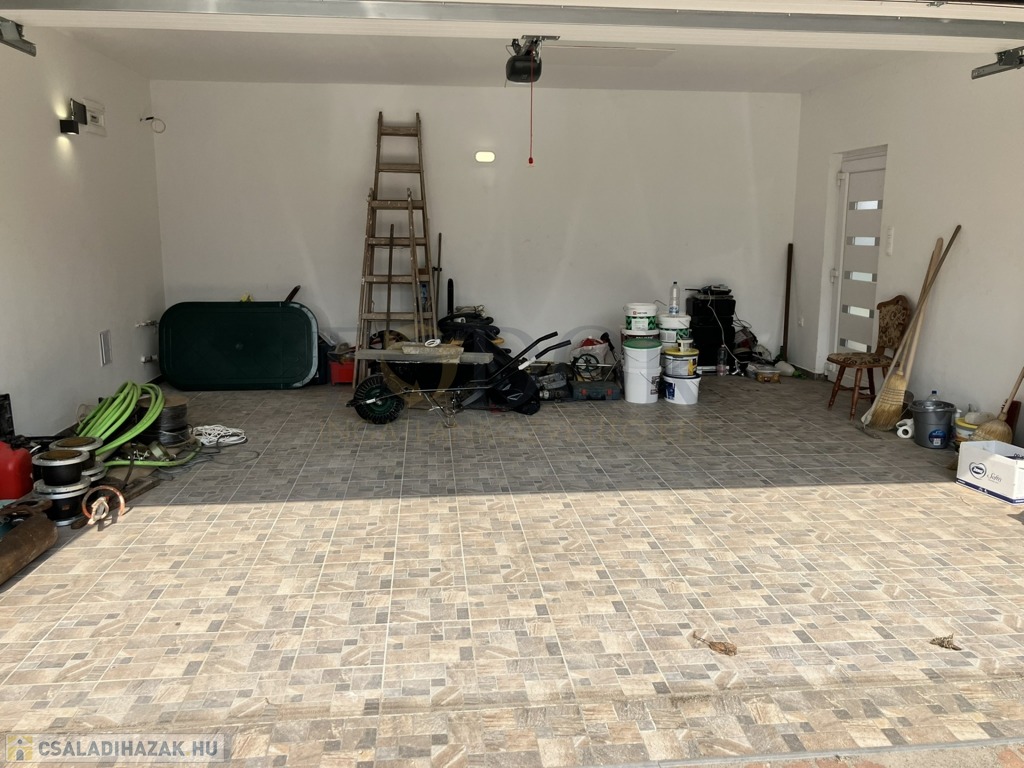 Az ingatlan különlegessége, hogy az utcafronton nem maga a lakótér, hanem egy 37 m²-es, dupla állásos garázs helyezkedik el, motoros, szekcionált garázskapuval. A garázs előtt viacolorral burkolt, több autó parkolására is alkalmas terület található. A kert megközelíthető a garázson keresztül, illetve egy külön kiskapun át is.