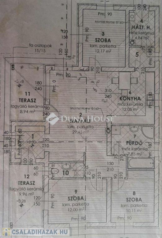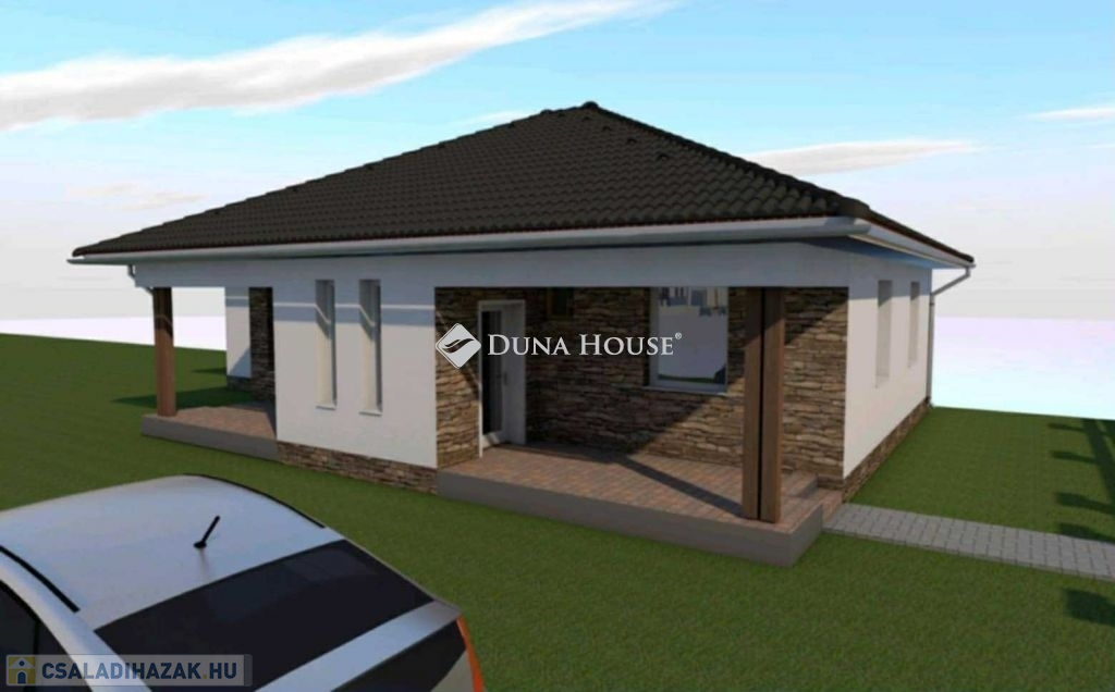 Kialakítása: 3 tágas szoba, nappali, konyha, előtér, közlekedő, fürdő, külön wc, háztartási helyiség, fedett terasz 19 m2.