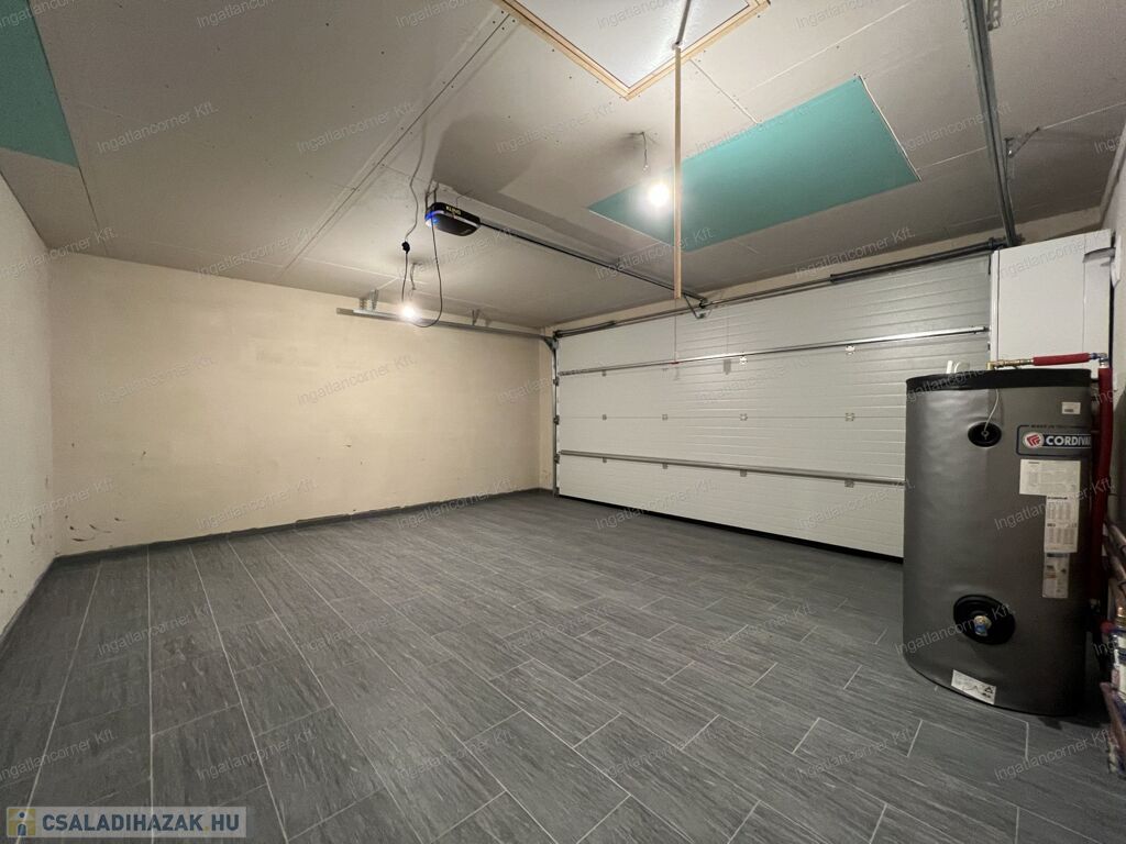 Elosztását tekintve kiváló: A hatalmas amerikai konyhás étkező-nappalin kívül, 4 hálószobával, 1 fürdőszobával, mosókonyhával, WC, kamra, rendelkeznek illetve 21 nm terasszal és 28nm garázzsal, elektromos ajtóval szerelve!
