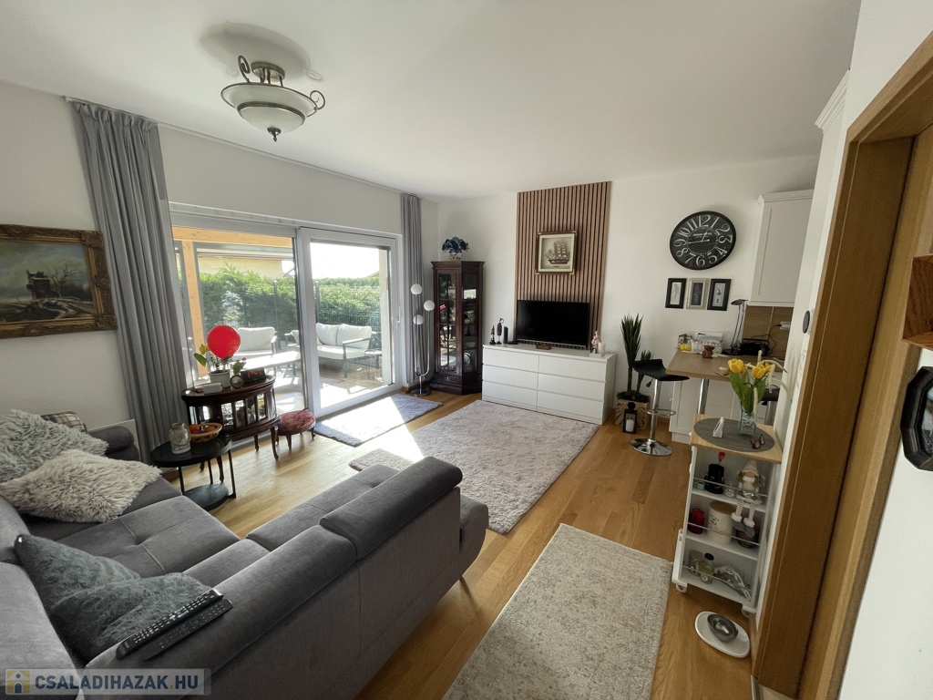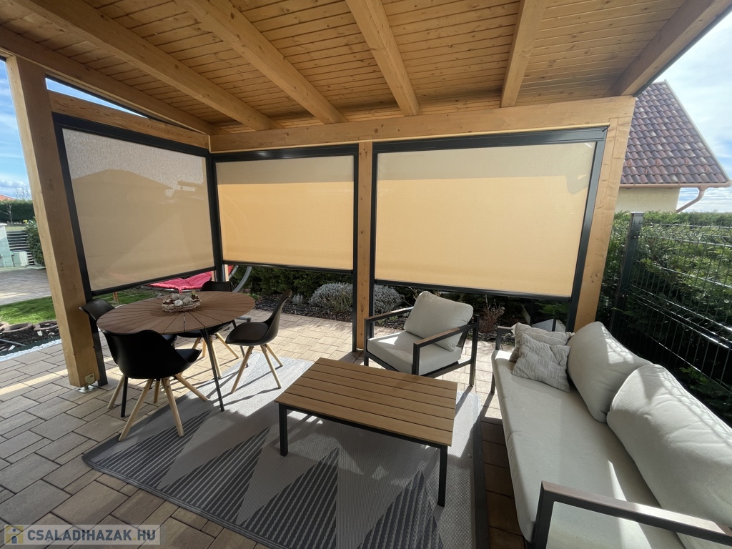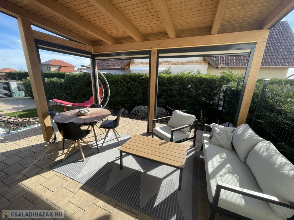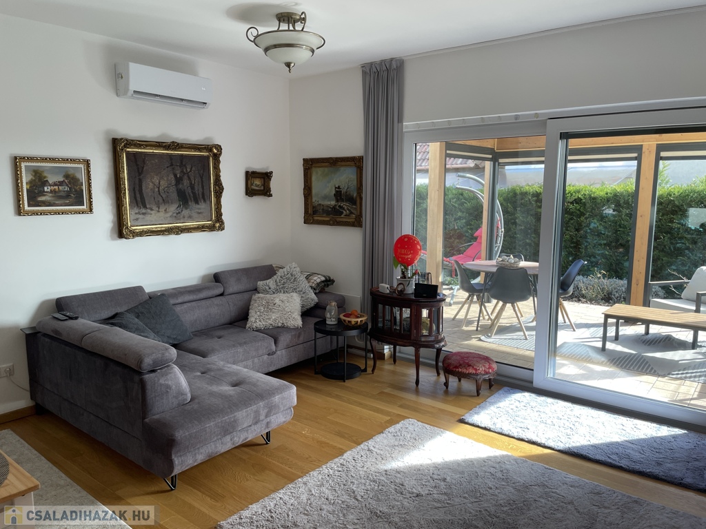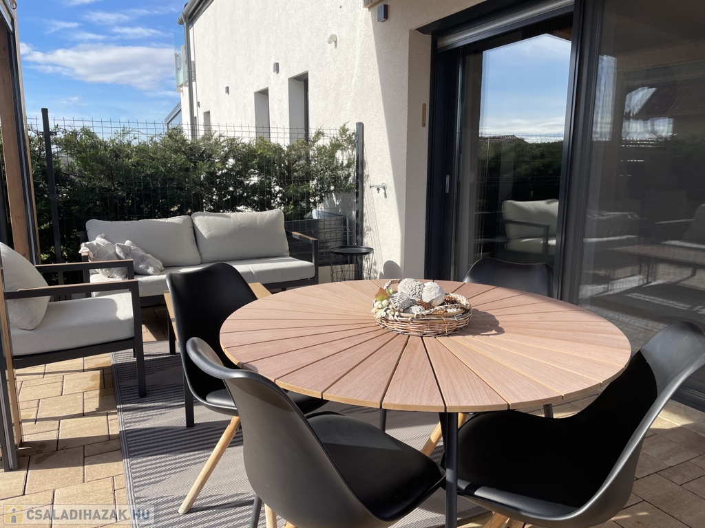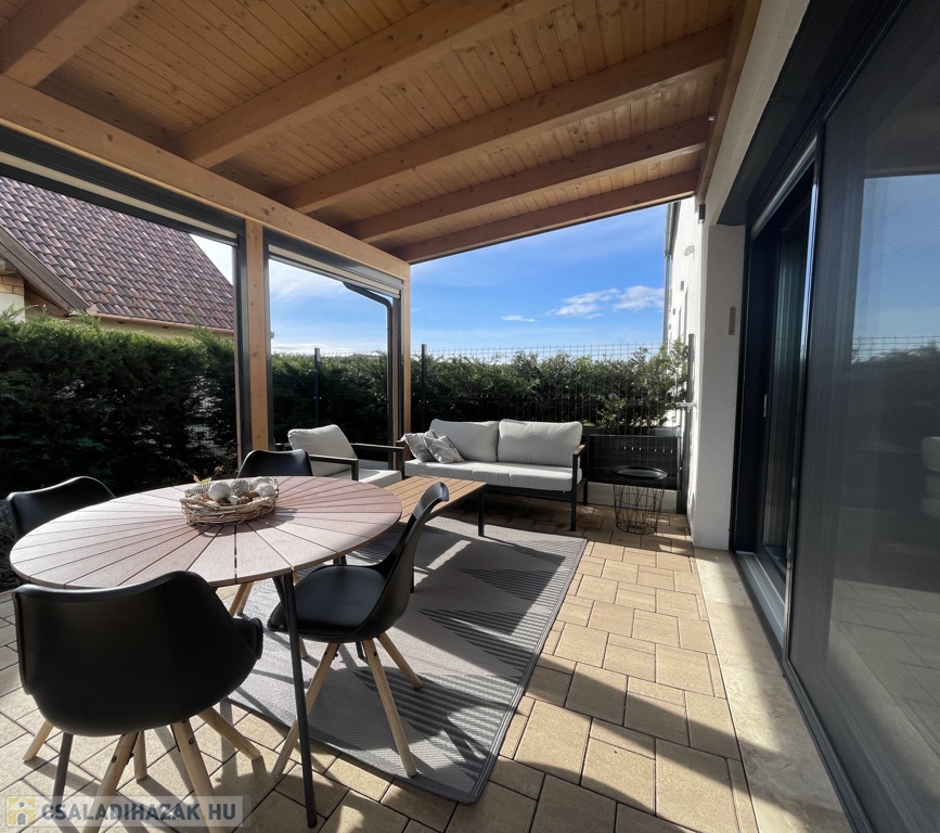 A földszinten található tágas, napfényes nappali–konyha–étkező egy légtérben helyezkedik el, közvetlen teraszkapcsolattal. A kert felé nyíló tér természetes módon köti össze a belső életteret a szabadtéri pihenéssel – nyári vacsorákhoz, baráti beszélgetésekhez vagy egy nyugodt balatoni estéhez ideális választás. A kerti terasz elektromos árnyékolóval felszerelt, így a legmelegebb napokon is kellemes marad.