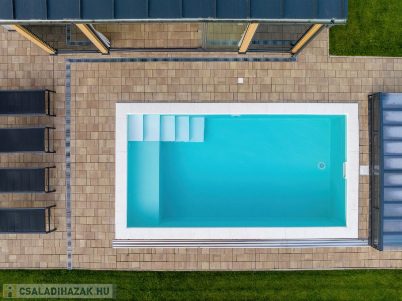 - H tarifás villanyóra - 6x3 m- es vasbeton szerkezetű, hőszivattyúval fűtött medence napozórésszel. (gépházzal, automatizált gépészettel)