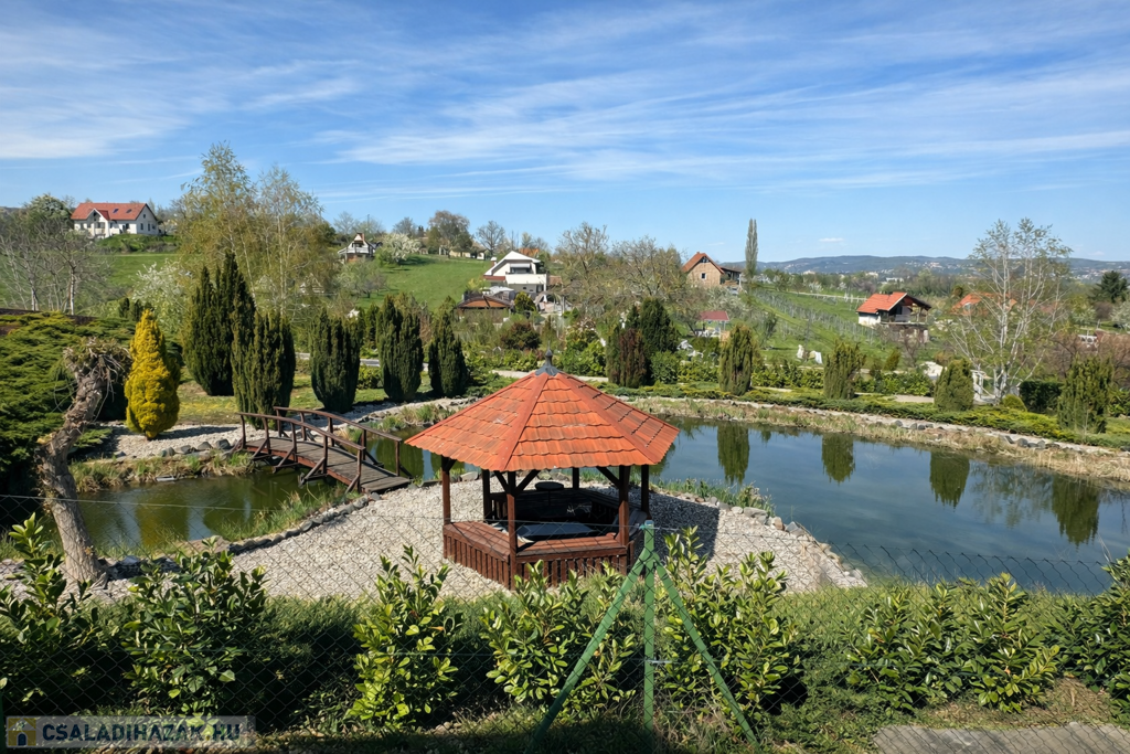 A gondozott kert számos lehetőséget kínál a pihenésre: 120 m²-es grillterasz, kerti sütögető, valamint egy hangulatos, 45 m²-es fedett kerti pavilon áll rendelkezésre. Emellett egy fedett medence is kialakításra került (10 × 4 m, kb. 1,5 m mély), amely üvegtetővel lefedhető, így szinte egész évben használható. A kertben dekoratív tó, saját kút és automata öntözőrendszer is helyet kapott.
