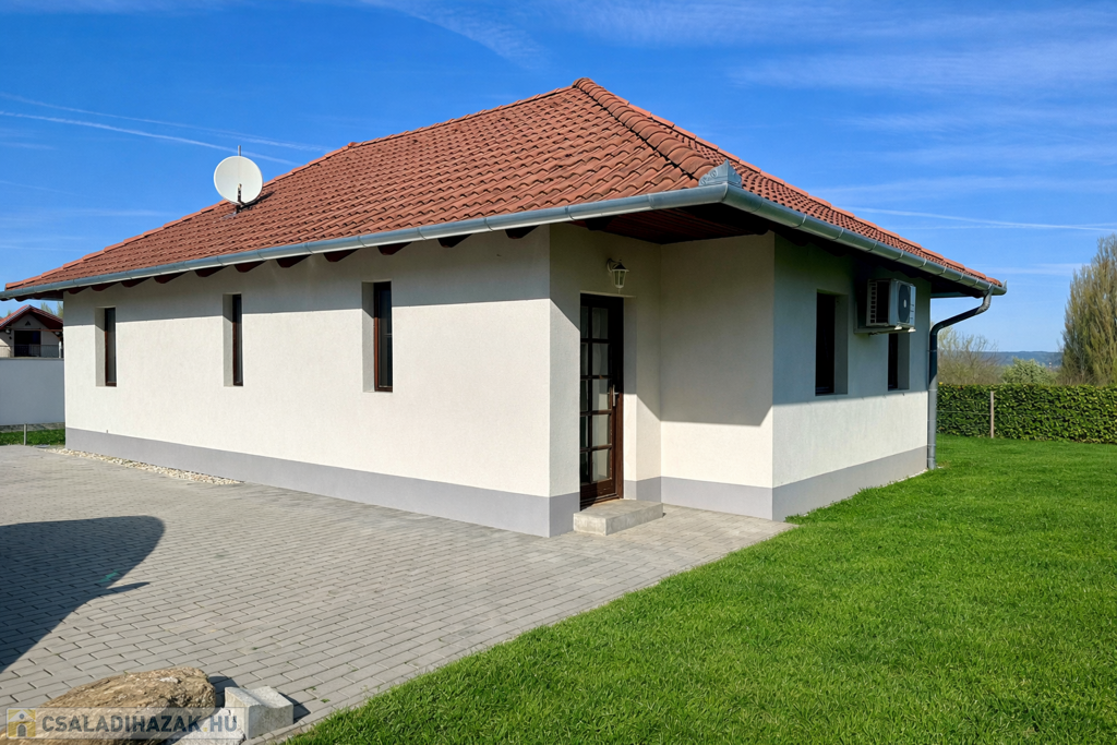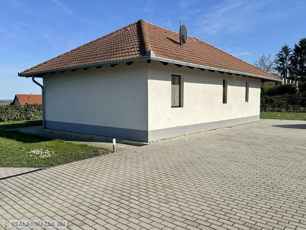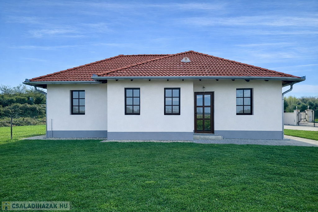 A ház egyszintes, nettó 90 m² lakóterülettel rendelkezik, amelyhez egy 45 m²-es földszinti pince (borospince) és egy fedett tároló is tartozik. A belső elrendezés modern és praktikus: amerikai konyhás nappali, 2 külön nyíló szoba, gardróbszoba, fürdőszoba, valamint külön WC.