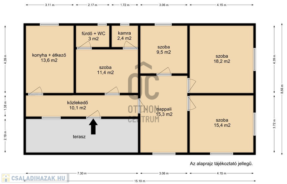 4 külön nyíló szoba, tágas nappali, konyha-étkező, fürdő–WC, kamra, közlekedő és egy kellemes terasz alkotja