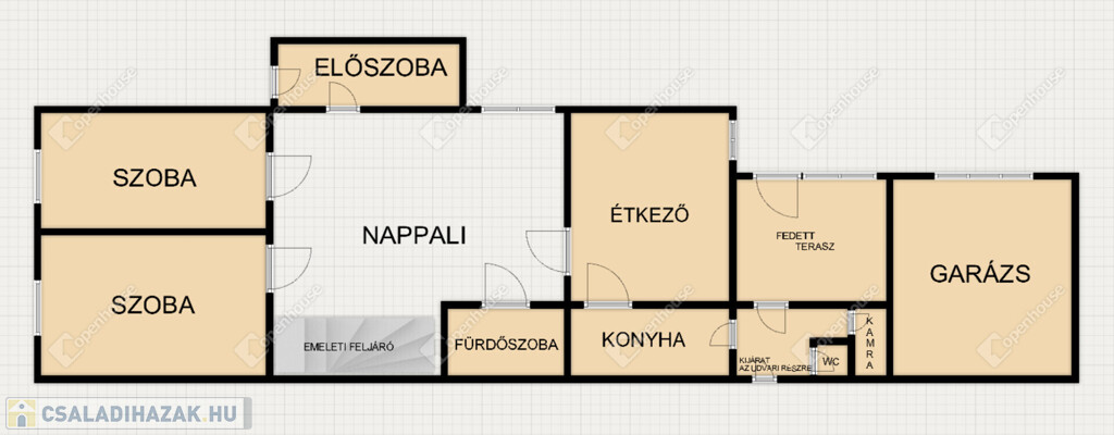 Alsó szint: közlekedő, konyha, étkező, nappali, két hálószoba, fürdőszoba.