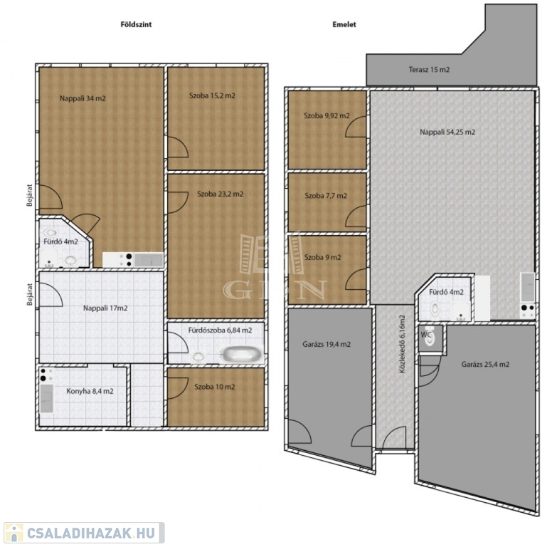 A felső lakás 136 m2-es, ami magába foglalja a két fűtött garázst is (19,4, 25,4m2), melyek elektromos garázsajtóval lettek ellátva.