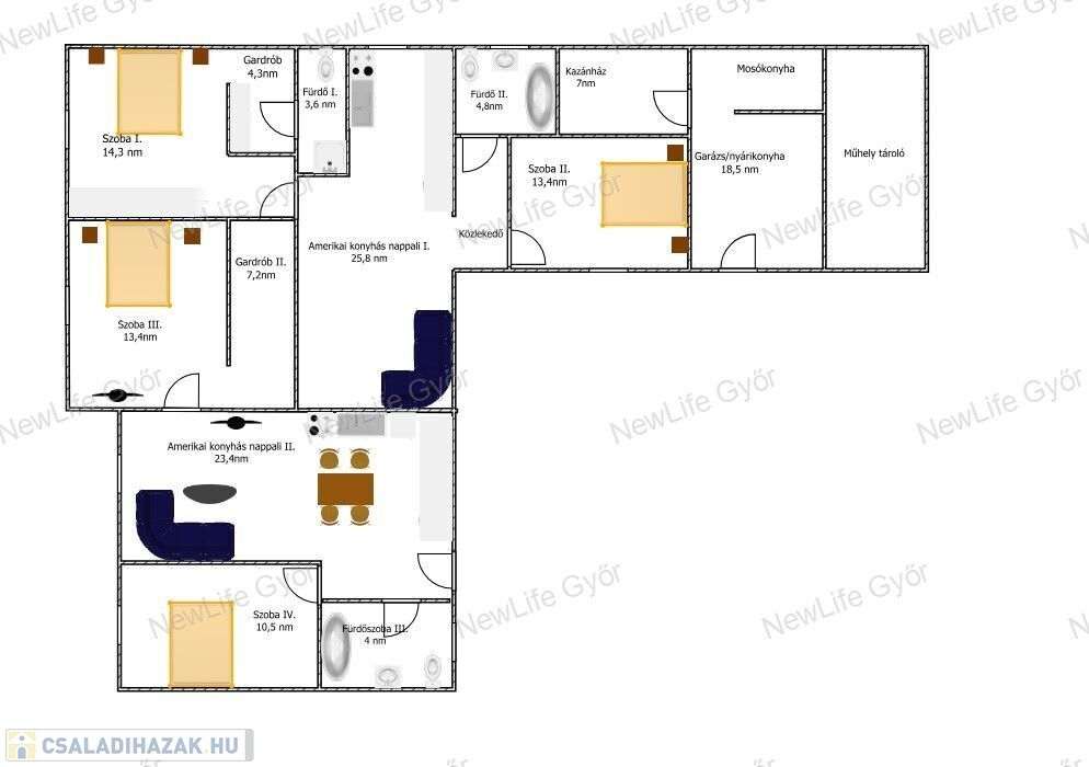 Mindkét rész amerikai konyhás nappali+ 2 hálószobás+ egy-egy gardrób lett kialakítva.. Az egyik házban két fürdőszoba van, míg a másikban egy.
