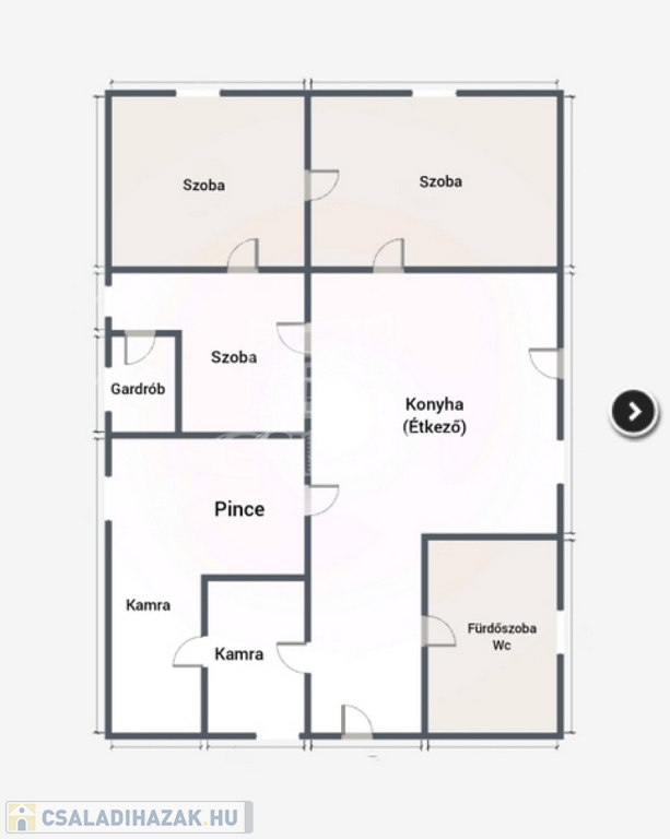Az ingatlanban található 3 szoba, egy gardrób, továbbá egy fürdőszoba+ wc, egy konyha étkezővel, valamint egy pince és 2 kamra melyből az egyikben található a padlásfeljáró.