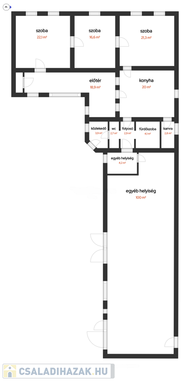 A 120 m2-es lakótér 3 benapozott szobával és nagy alapterületű konyhával rendelkezik, utóbbi kialakítása a vevőre vár.