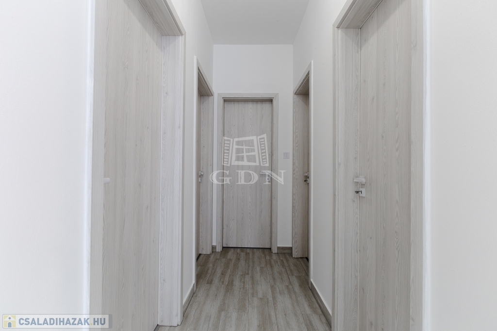 Dekorfóliás belső ajtók. A homlokzati fehér műanyag nyílászárók 3 rétegű hőszigetelő üvegezésűek (U=1,0 W/m²K).