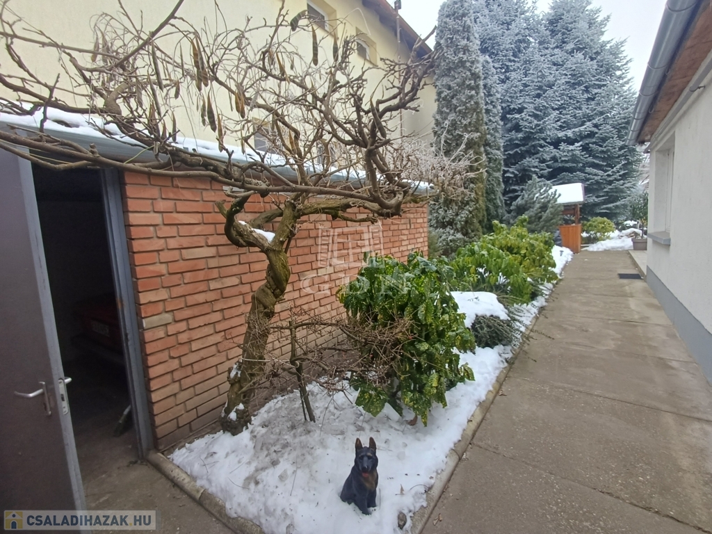 A házhoz pince is tartozik, valamint az udvarban fúrt kút segíti a kert gondozását. Az utcáról nyíló, elektromos kapuval ellátott 14 nm-es garázs kényelmes parkolást biztosít.