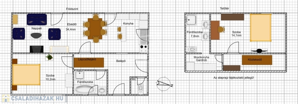 Földszint: nappali–étkező, konyha, 1 szoba, fürdőszoba, külön WC, előtér
