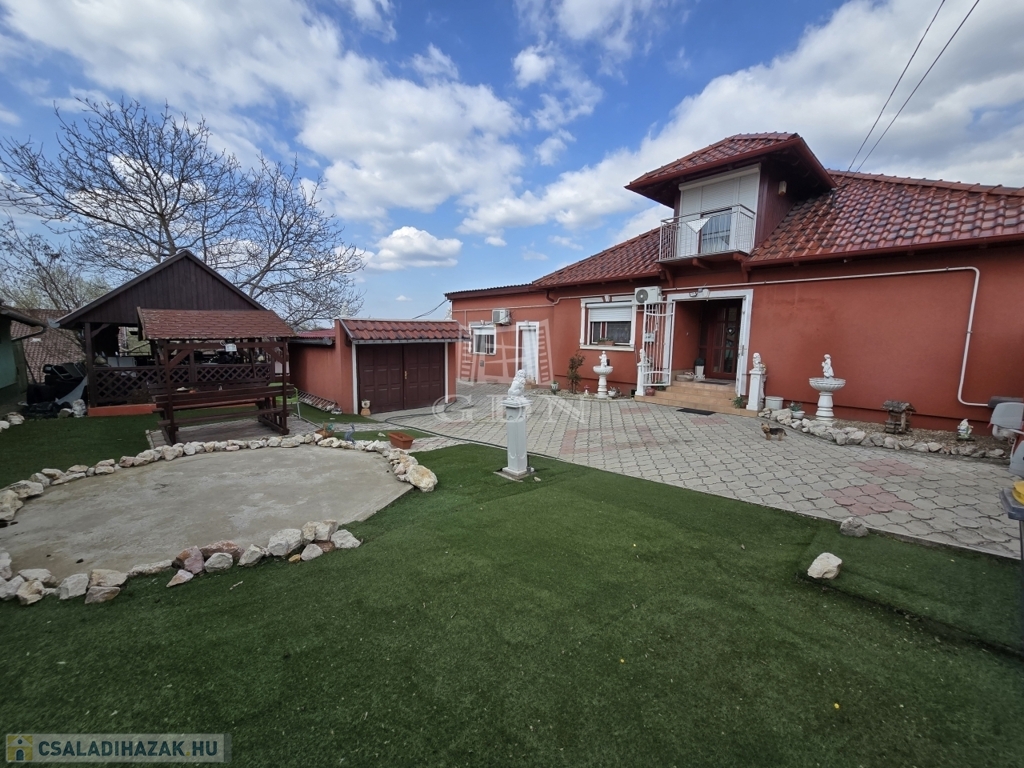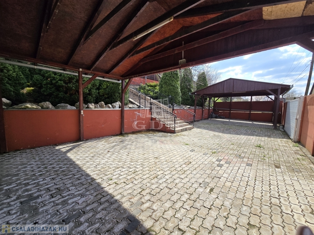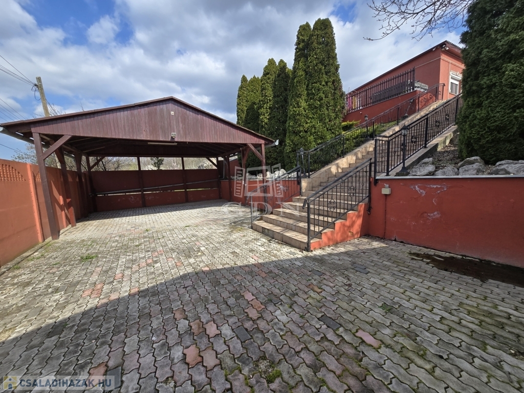 Az alsó udvar szintén részben térkövezett, és külön utcáról is megközelíthető. Itt két fedett gépkocsibeálló került kialakításra, amelyek alatt akár több jármű parkolása is kényelmesen megoldható, így az ingatlan nemcsak nagycsaládosok számára ideális, hanem akár vállalkozási vagy befektetési célra – például szállásadásra – is kiváló lehetőséget kínál.