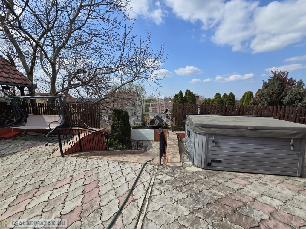 A felső szinten elhelyezkedő ház és az első udvar egy kiemelt, magasabb ponton található. Ez a tér teljes egészében térkövezett egészen a garázsig, kiegészítve egy igényesen kialakított műfüves résszel, valamint két hangulatos kiülővel – köztük egy tágas, fedett, családi és baráti összejövetelekre is ideális térrel. Itt kapott helyet a garázs, valamint a jakuzzi is, amely tovább emeli az ingatlan komfortját.