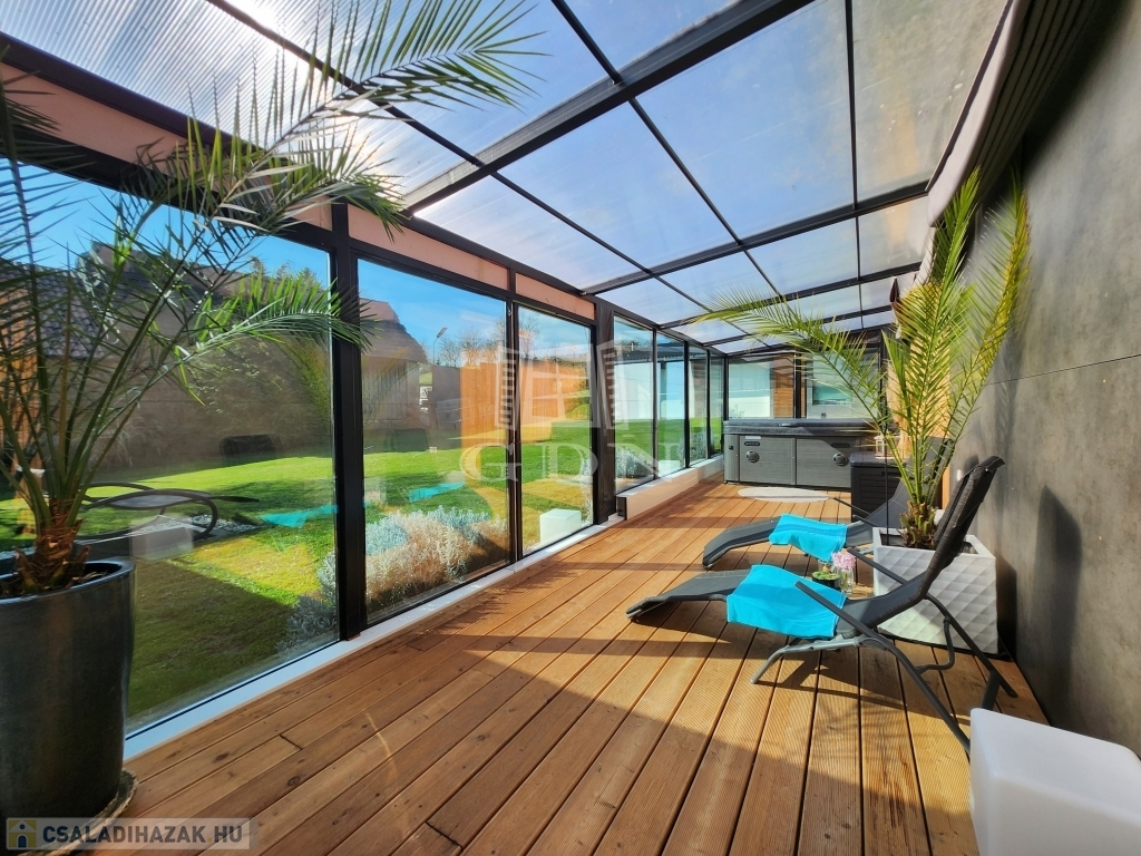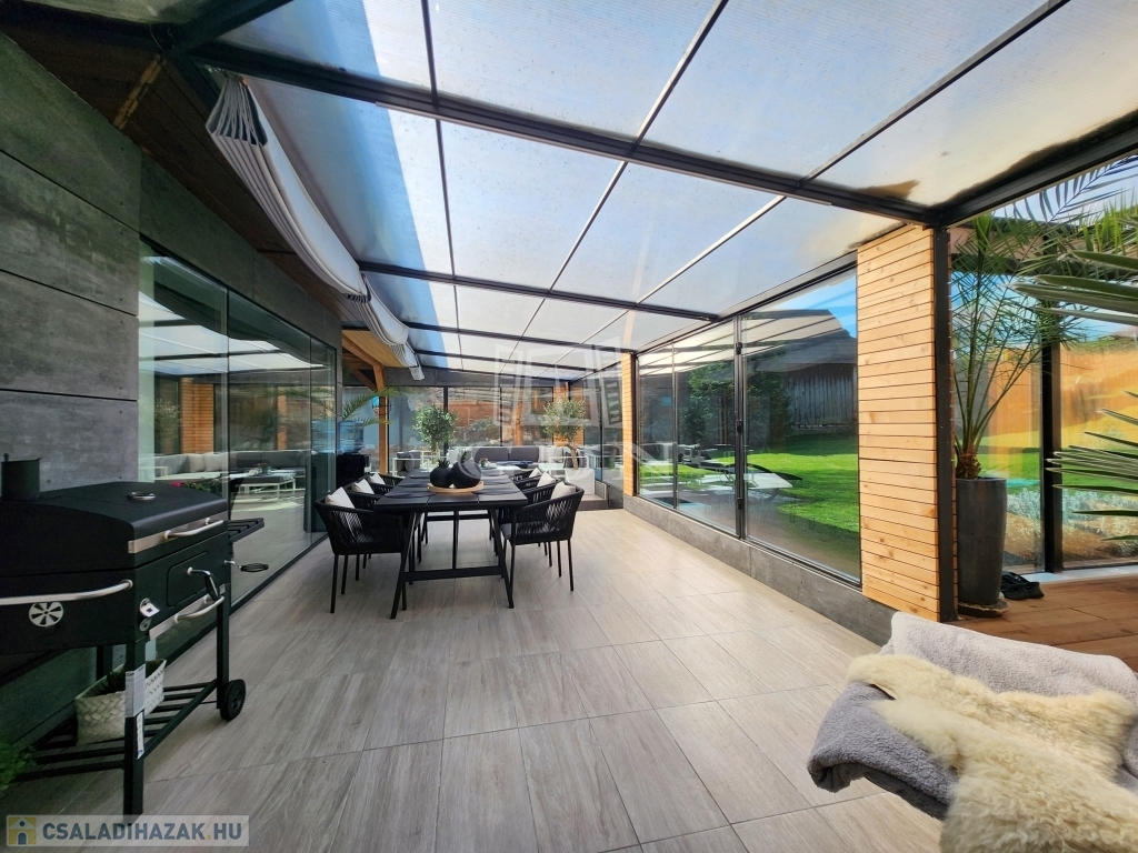 Csendes, árnyékolókkal ellátott 80 m2-es terasza pihenésre, családi összejövetelekre, kikapcsolódásra " született". Óriás üvegfelületei, kertre néző kilátása és a nyugalom, amely árad belőle, páratlan érzést képes nyújtani!