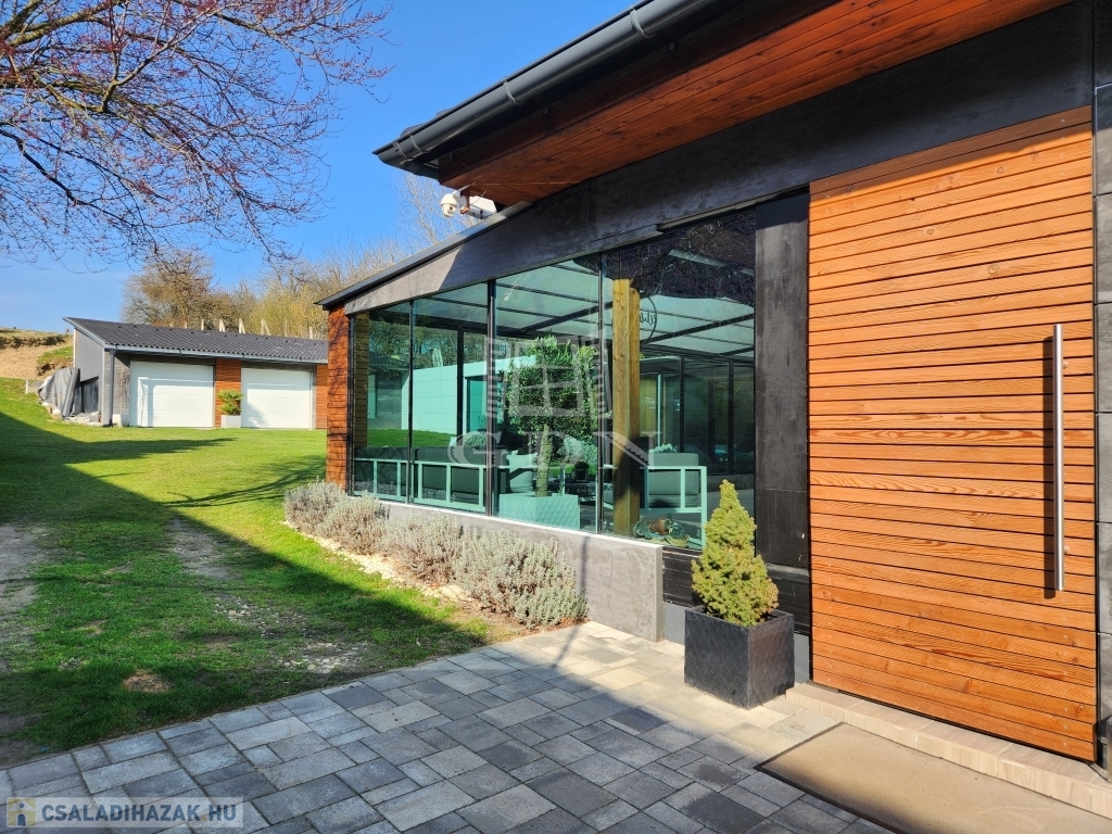 Az ingatlan 120 m2 nagyságú, nappali - konyha - étkező együttes és kettő háló kialakítású, 80 m2 terasszal, dupla garázzsal, melynek folytatása a panorámás 3539 m2 nagyságú birtok felső része.