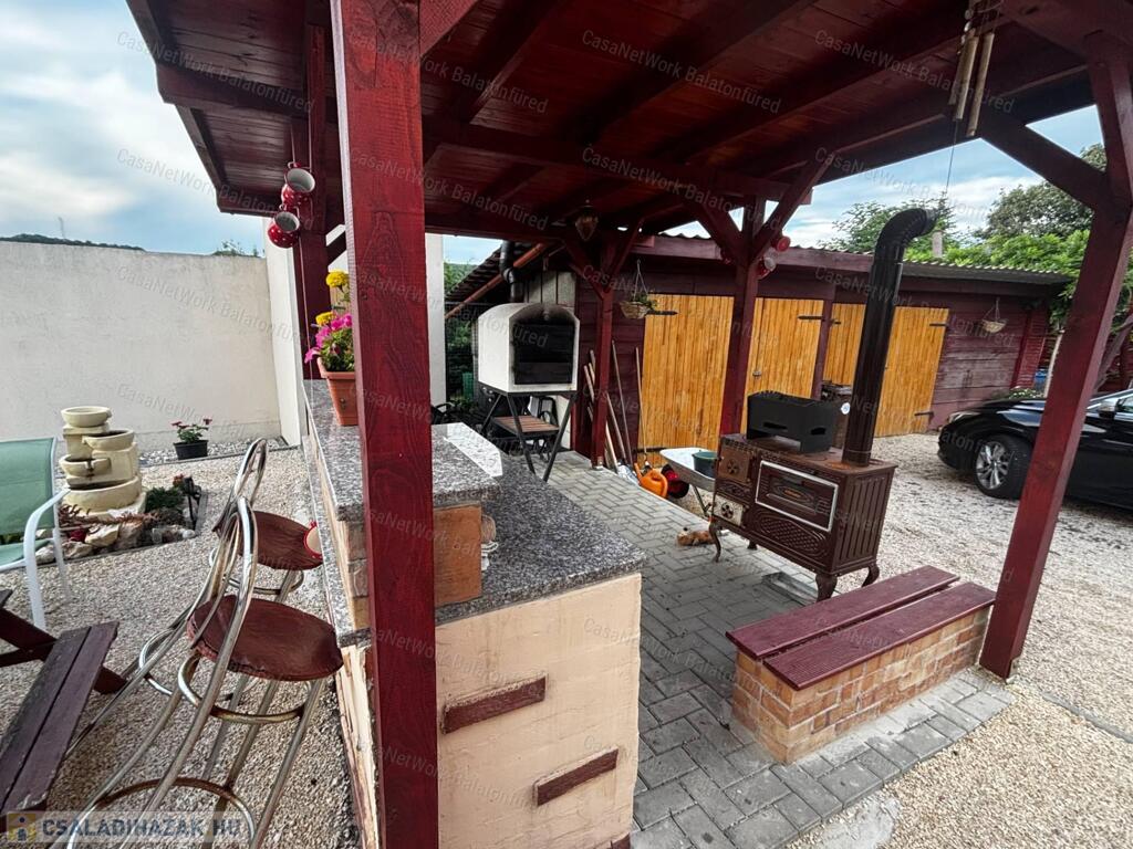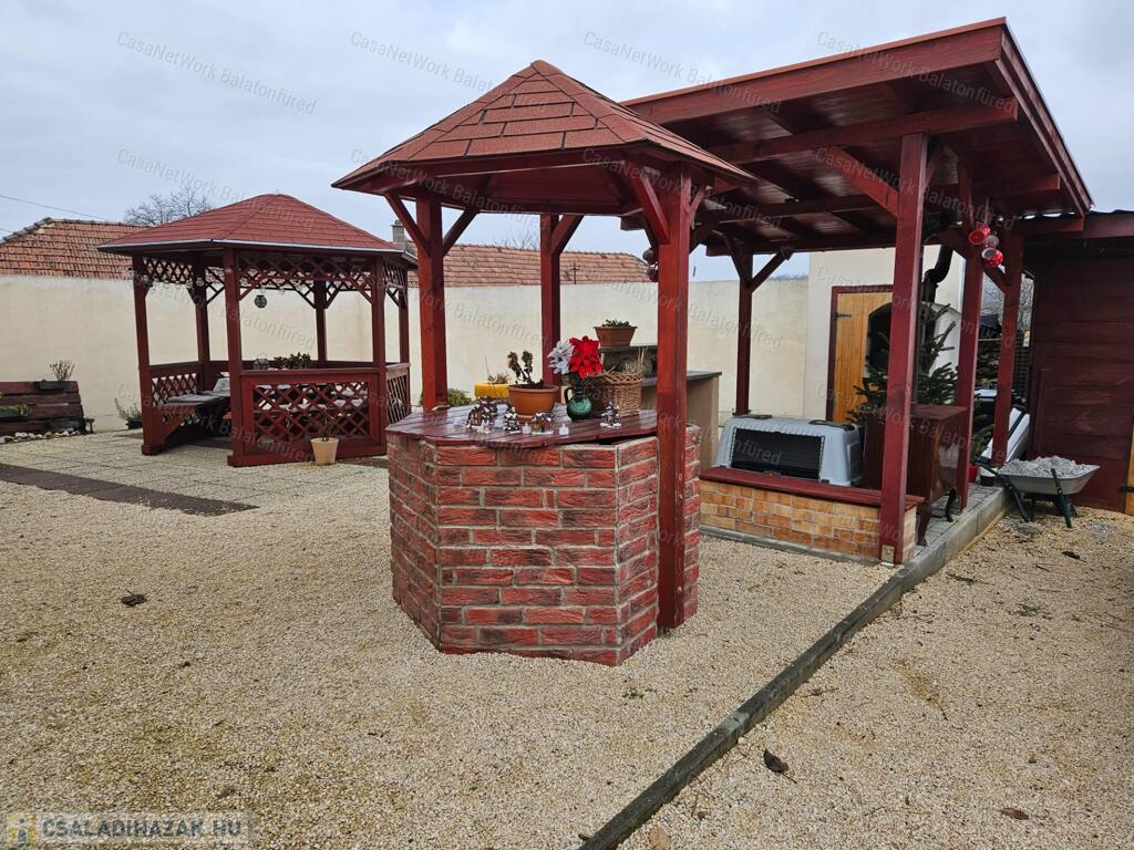 - A házhoz nagyjából 800 m2 telekterület tartozik, ahol 3 gépkocsi számára beálló, 2 tároló, játszósarok (homokozóval, csúszdával), sütögető, fedett pergola, kis tó található. Dísznövények színesítik az udvart.