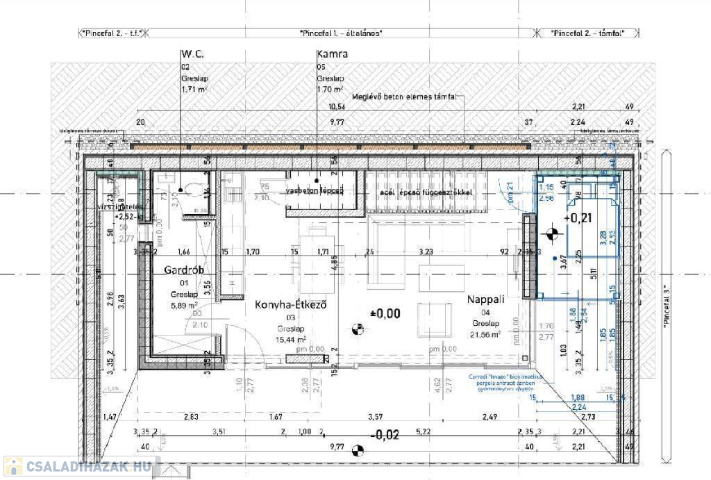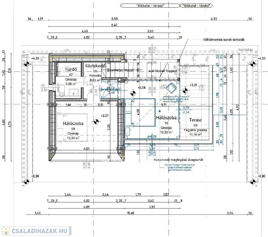 - 8,9 m2-es közlekedő (belső acél lépcsőfeljáró függesztőkkel)