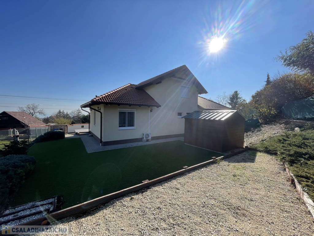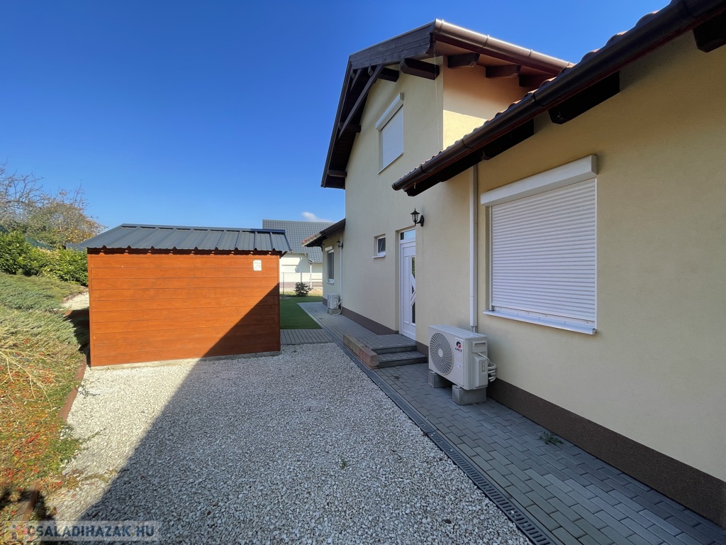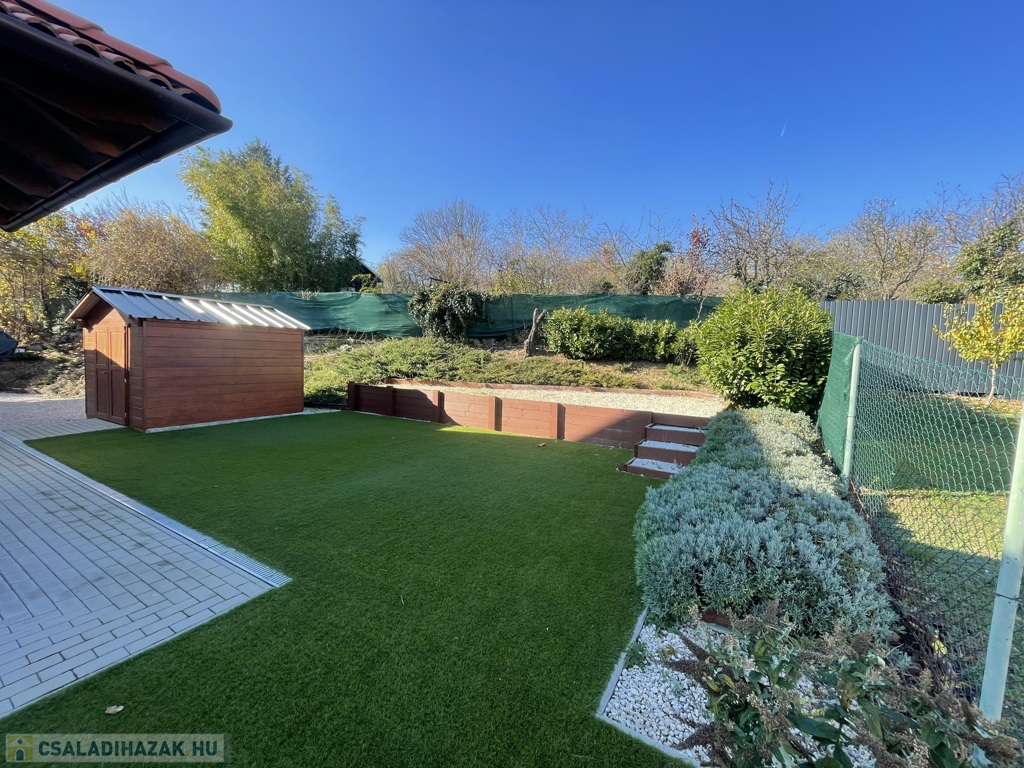 A gondozott kertben 9 m²-es faház szolgál tárolóként. 4 autó számára kialakított parkoló kényelmes megoldás a család minden tagjának. Közművek: víz, villany (földkábeles), csatorna – a gáz a telekhatáron belül elérhető.