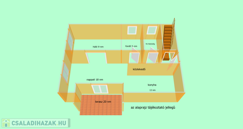 A földszinten nappali-étkező-konyha, hálószoba, fürdőszoba, tároló, közlekedő, lépcsőház található.