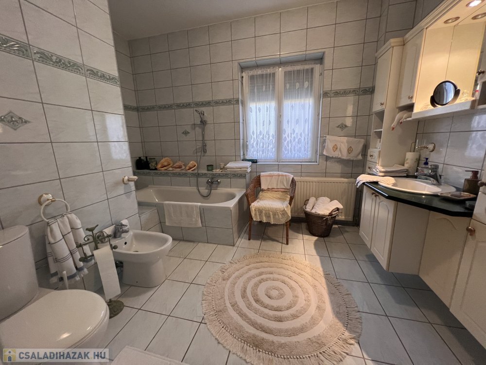 A földszinten emellett megtalálható egy nagy hálószoba, fürdőszoba, külön WC, kamra, kazánház és két, nagy méretű terasz, melyek közvetlenül a gondozott kertbe nyílnak.