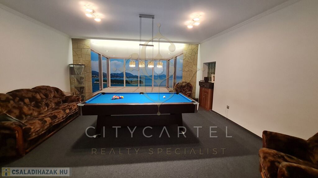 Külön épületben a garázs, tároló, modern konyha, nappali, szoba, biliárdszoba, konditerem jakuzzival, szauna két zuhanyzóval.