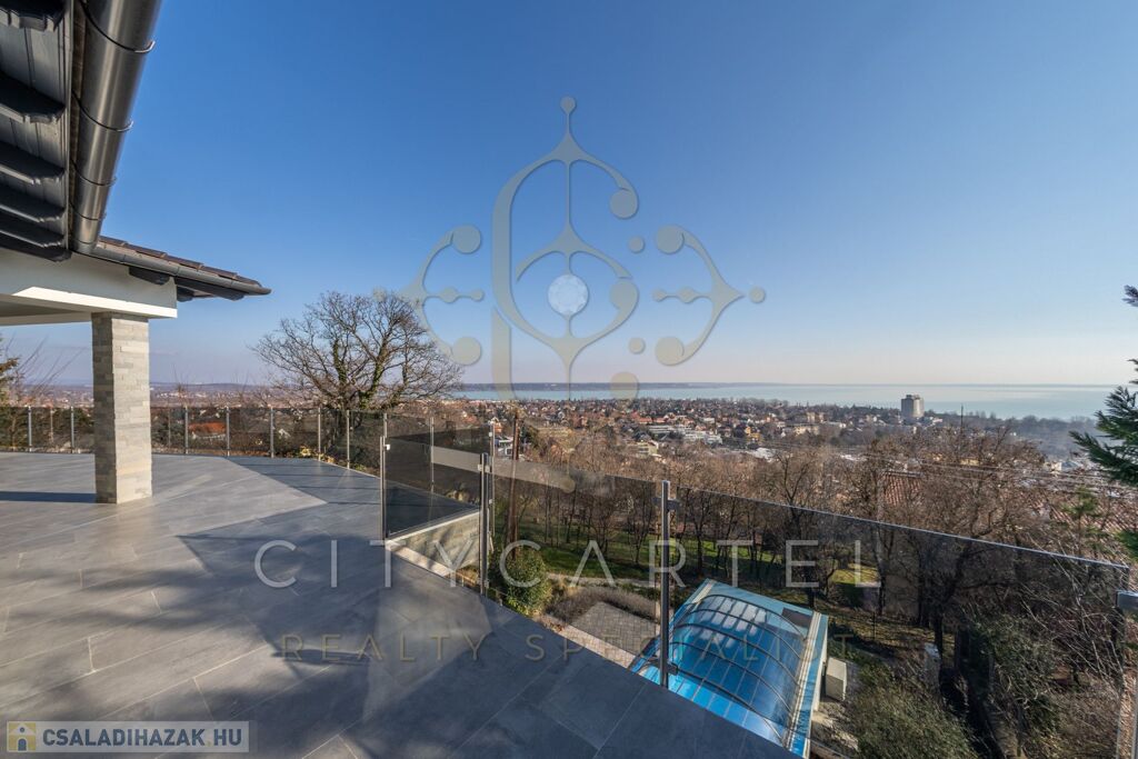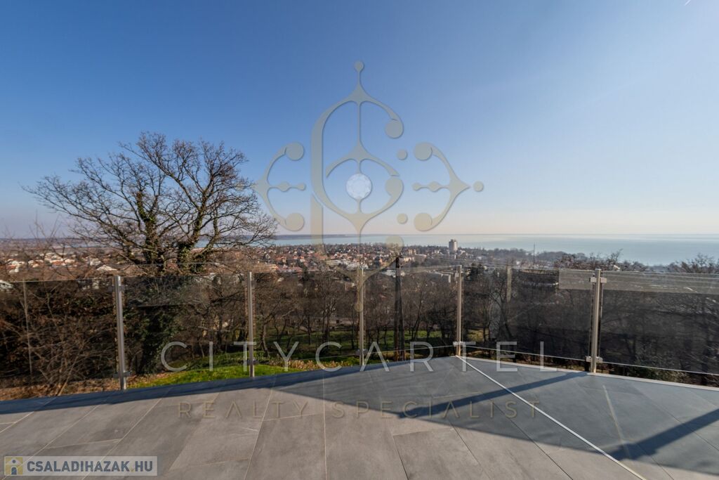A ház három szintes, dombra épült, letisztult, elegáns, kihasználva a telek kiváló adottságait. A hatalmas teraszokról gyönyörű kilátás nyílik a Balatonra! A tulajdonos nagy figyelmet fordított a minőségi anyagok használatára, mind a külső, mint a belső terek kialakításánál. Magas műszaki tartalom, a legmodernebb technikai megoldások jellemzik! Minden luxus igényt kielégít!