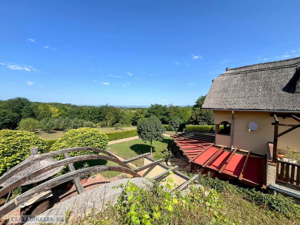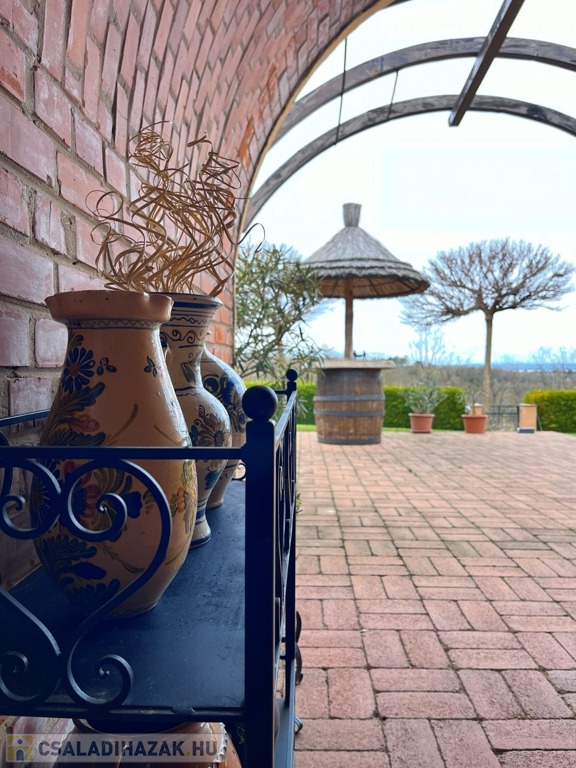 Balatonberény szőlőhegyén, egy zsákutca végén, a város zajától távol, mintha egy arborétumban lennénk, eladó ez a csodálatosan szép, panorámás, minden igényt kielégítő, pár éve épült ház. A ház erkélyeiről és a teraszról lenyűgöző kilátás nyílik a Keszthelyi-öbölre. Balatoni házként természetesen a borospince is adott, és hogy a gasztronómiai élvezetekért se kelljen a pincétől távol menni, egy nyárikonyha is kialakításra került a fedett pinceteraszon.