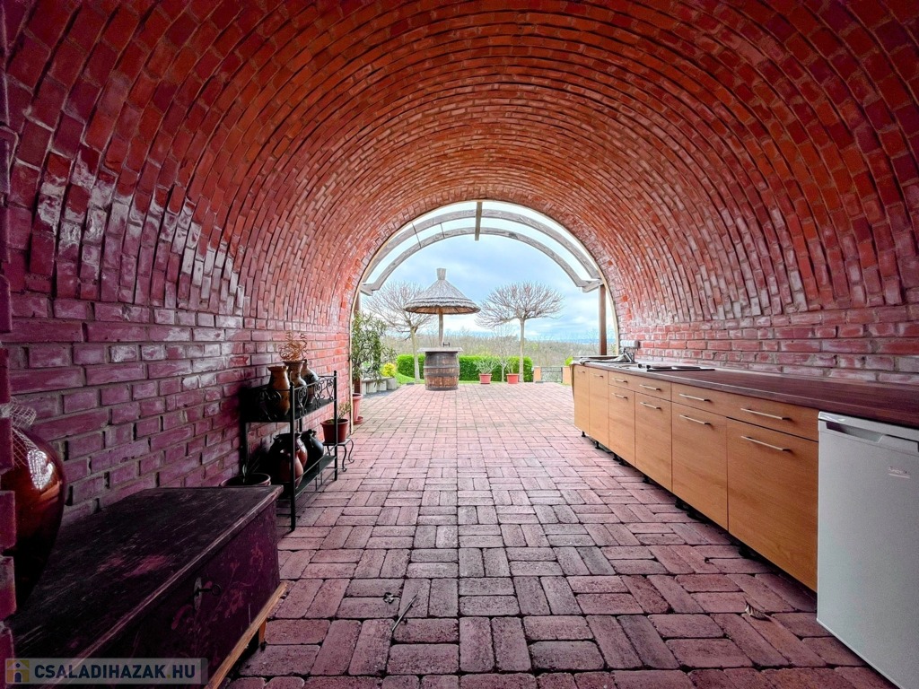 Látszik, hogy a külső tér kialakításánál cél volt, hogy minél több időt lehessen a szabadban tölteni, élvezve a csodás kilátást, a jó levegőt és a természet közelségét. A ház alsó szintje előtt egy nagy terasz lehet a család kedvenc helye, melyet pergola véd a melegtől. Innen pár lépés - melyből néhányat egy nagyon egyedi, fagerendákból kialakított lépcsőn teszünk meg - a borospince terasza. A 6x3-as boropince fedett “folytatása” a végén nyitott rész, mely egy árammal, vízzel ellátott teljes értékű nyári konyhát is rejt - tippünk szerint itt történnek majd a legjobb kerti összejövetelek.